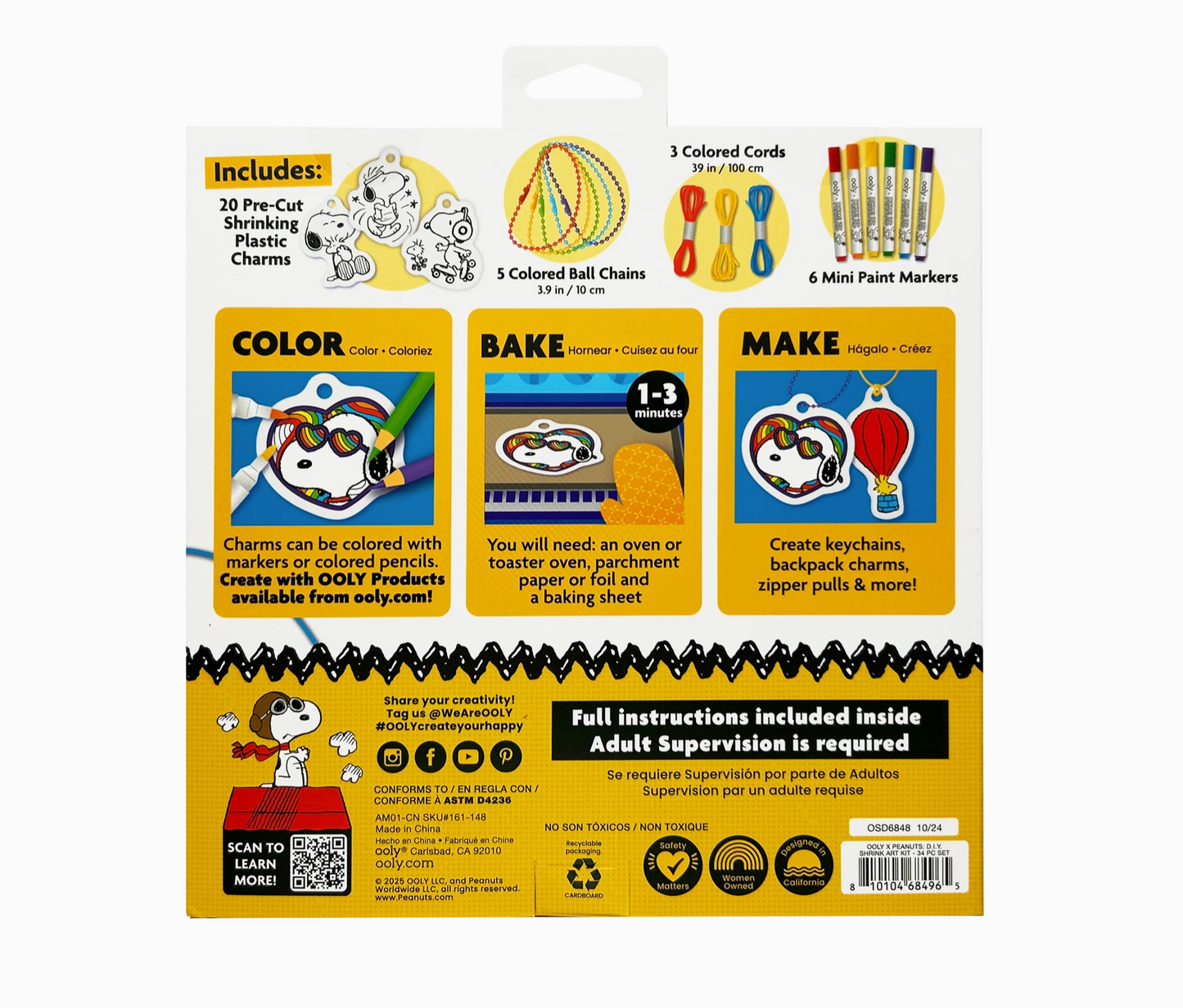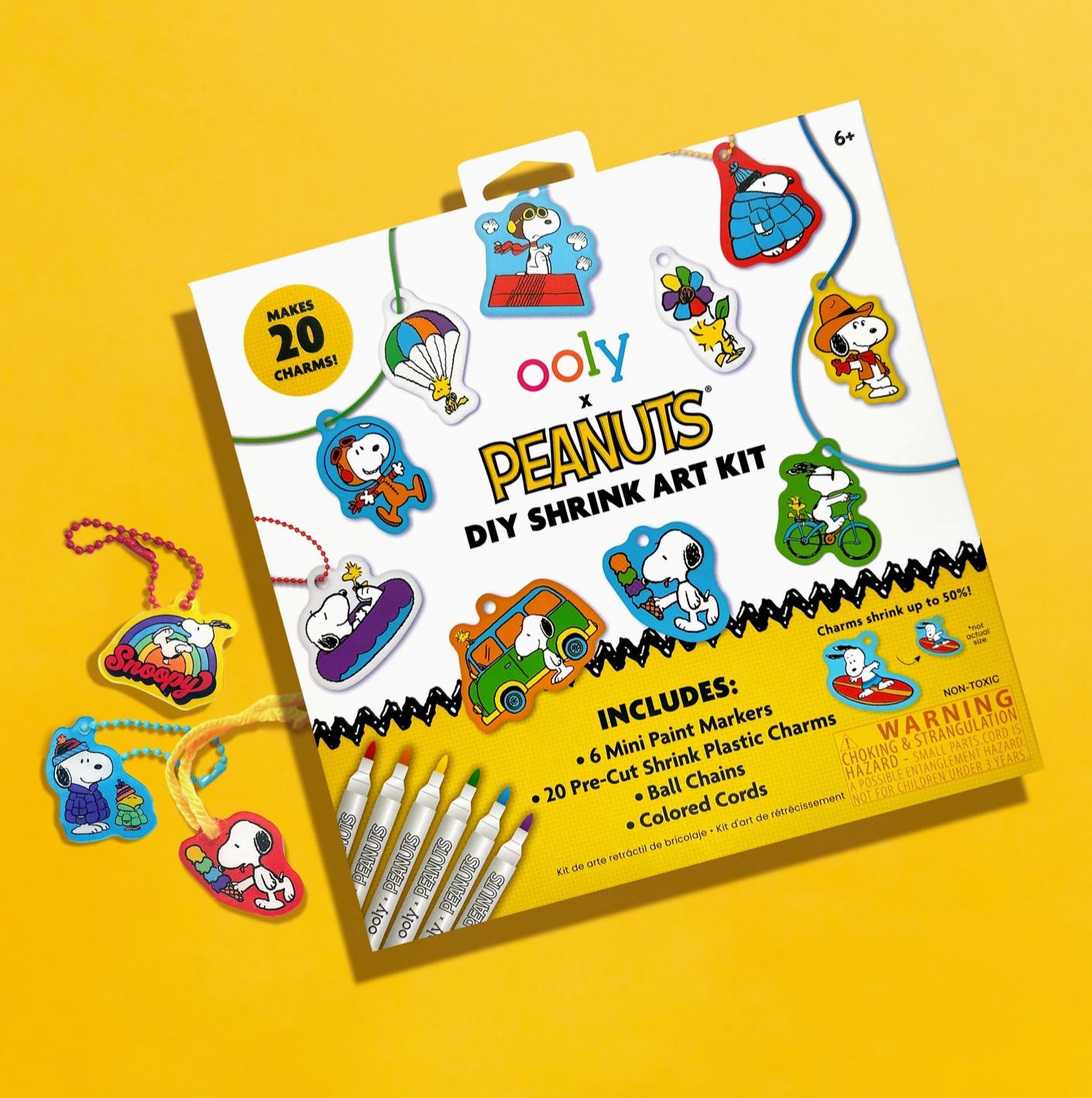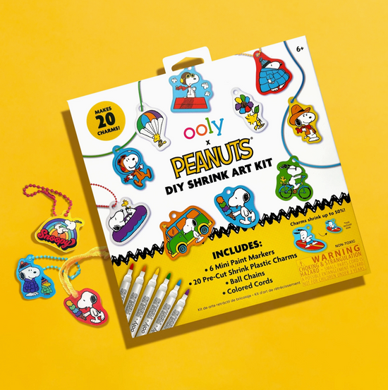 Make your own Snoopy charm-making kit! The OOLY x Peanuts DIY Shrink Art Kit lets you create 20 colorful Snoopy charms that shrink down to accessory size when baked. Complete with ball chains, colored cords, and mini paint markers, this craft kit is perfect for kids and Snoopy fans alike. Use these charms to personalize your backpack, keychain, or anything else kids love to decorate! Whether you’re showing off your loyalty to Snoopy or creating charms inspired by your favorite Snoopy moments, this DIY shrink art kit adds creativity and fun to every project.